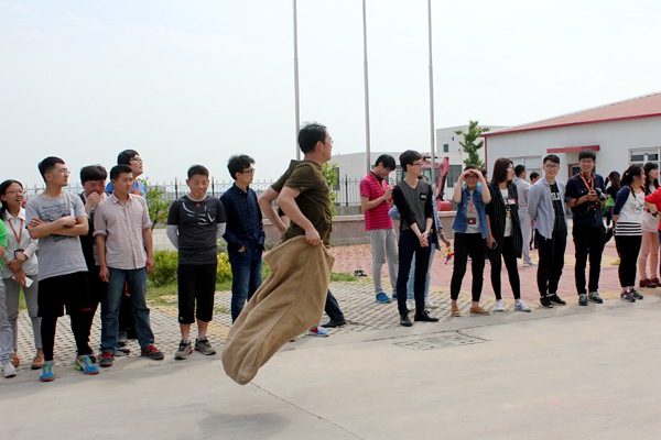 袋鼠跳,一名名参赛队员钻进布袋里,竞速跳跃,摔倒了不气馁,爬起继续完成接力,蹦蹦跳跳好不热闹。